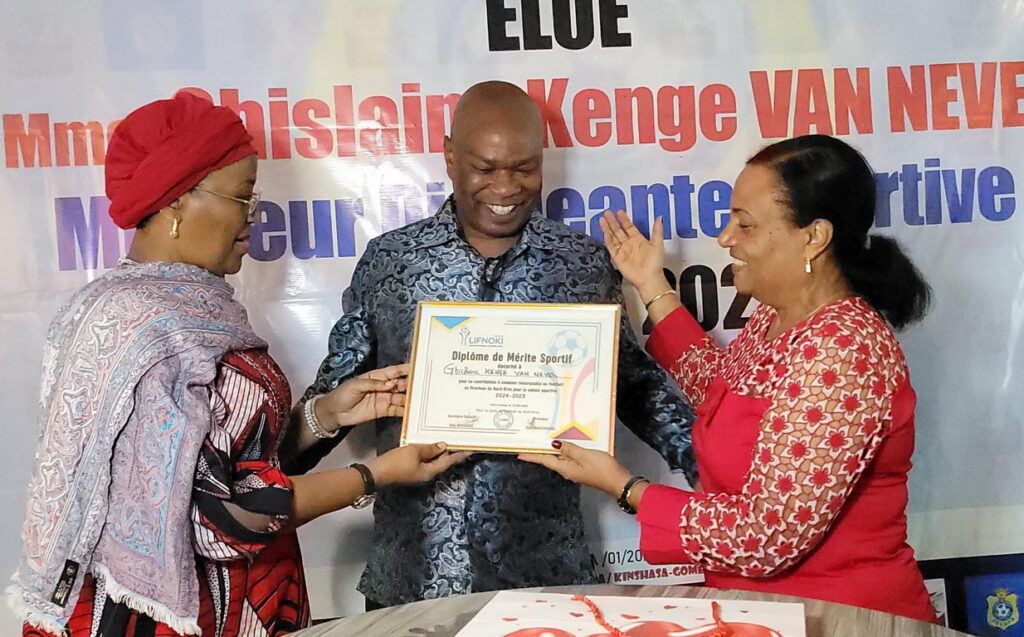 Une cérémonie spéciale de plébiscite a été organisée à Kinshasa en début de semaine, pour honorer Madame Ghislaine KENGE VAN NEVEL, Présidente de l’Union Sportive SOCOZAKI de Butembo. En effet, la Ligue de Football du Nord-Kivu par le biais du président Eldé VAKATSHURAKI lui a décerné à cette occasion un Diplôme de Mérite Sportif, pour « sa contribution ô combien remarquable au football en province du Nord-Kivu, pour la saison sportive 2024-2025. » Elle est ainsi récompensée pour l’ensemble de son œuvre en faveur de son équipe qui a fait la fierté de la province, en s’adjugeant une précieuse médaille de bronze à la dernière édition de la Coupe du Congo. Pas que, ce valeureux diplôme est une façon pour la LIFNOKI de l’encourager à poursuivre non seulement sa lutte mais également à demeurer un modèle pour toutes les femmes désireuses à donner un coup de pouce au football nord-kivucien.