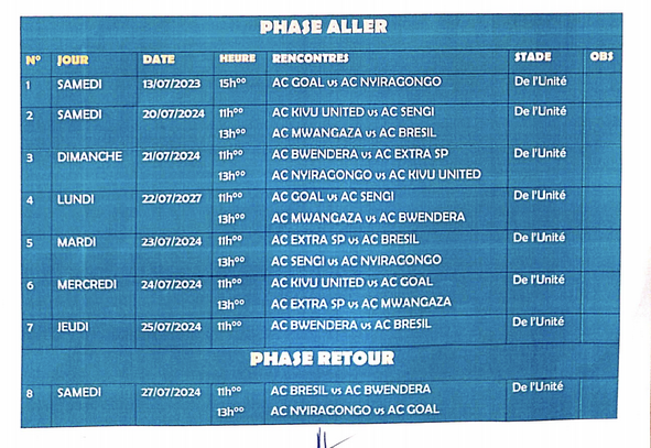 L’édition expérimentale 2023-2024 du championnat des académies de football du Nord-Kivu pour les moins de 15 ans, a été lancée ce mardi 20 Août 2024, au stade de l’Unité, en ville de Goma. Jour 1, voici les résultats: – AC GOAL – AC Étoile de l’Est (4-0). Buteurs: Lutula LODY (24′ et 60′), Jonas MASHAURI (29′) et Glody Kambale KUBITO (61′). – AC Mwangaza – AC Brésil AC (0-1). Buteur: WIlondja MUKAMBA (69′). – AC Nyiragongo – AC Kivu United (0-2). Buteurs: Akilimali BIABULE (6′) et Joy Manegabe (12′). Et – AC Bwendera – AC Extra Sport (1-1). Buteurs, côté Bwendera : Kasongo MULOPWE (9′) et côté Extra Sport : Moussa KASEREKA (50′).