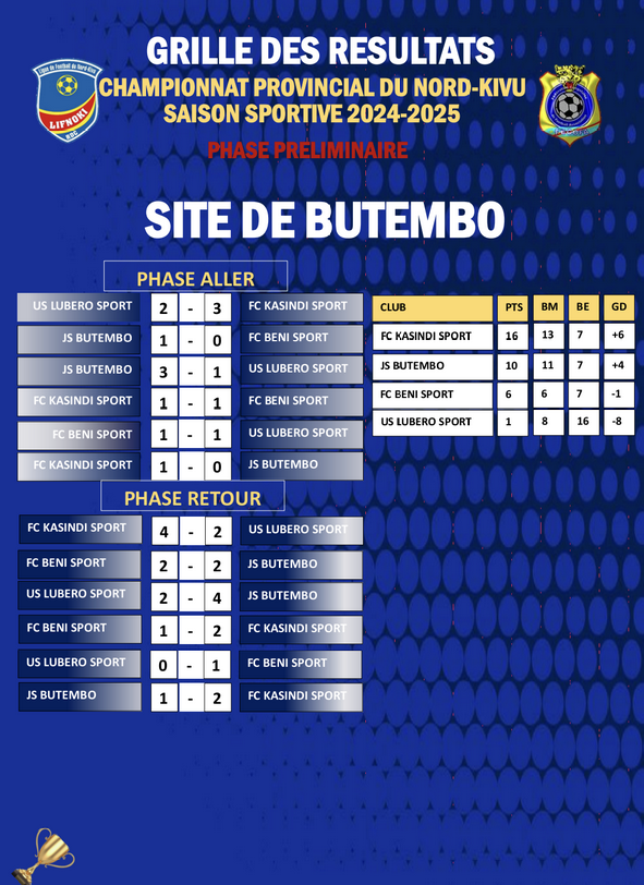Suivent, la JS Butembo Sport avec 10 points, le FC Beni Sport avec 6 points et l’US Lubero Sport avec 1 petite unité.