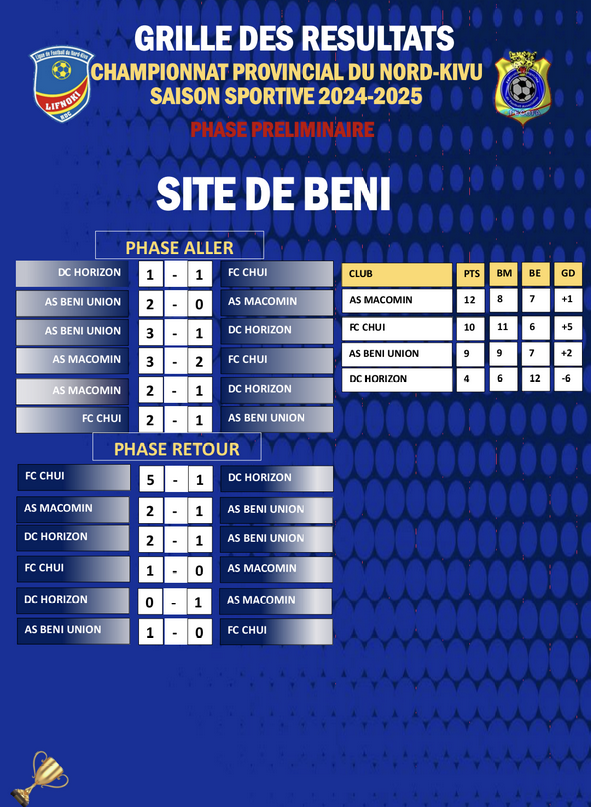 L’AS MACOMIN a arraché l’unique ticket qualificatif pour la finale pour le site de la ville de Beni. L’équipe de Mangurejipa dans le territoire de Lubero, pointe en première position avec 12 points, devançant ainsi, le FC Chui (10 points), les locaux de l’AS Beni Union (9 points) et le DC Horizon (4 unités).